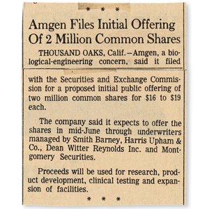 A May 1983 article of The Wall Street Journal announces Amgen’s IPO.