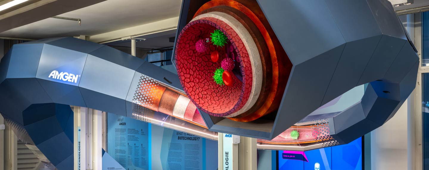 Nearly 30 Amgen employees from Amgen’s two sites in Germany (both recently featured in the Places of Amgen series on Instagram) assisted in designing the new exhibition materials, which include interactive videos, animations, models and graphics that illustrate how biotechnological medicines are created and how they can fight serious diseases.