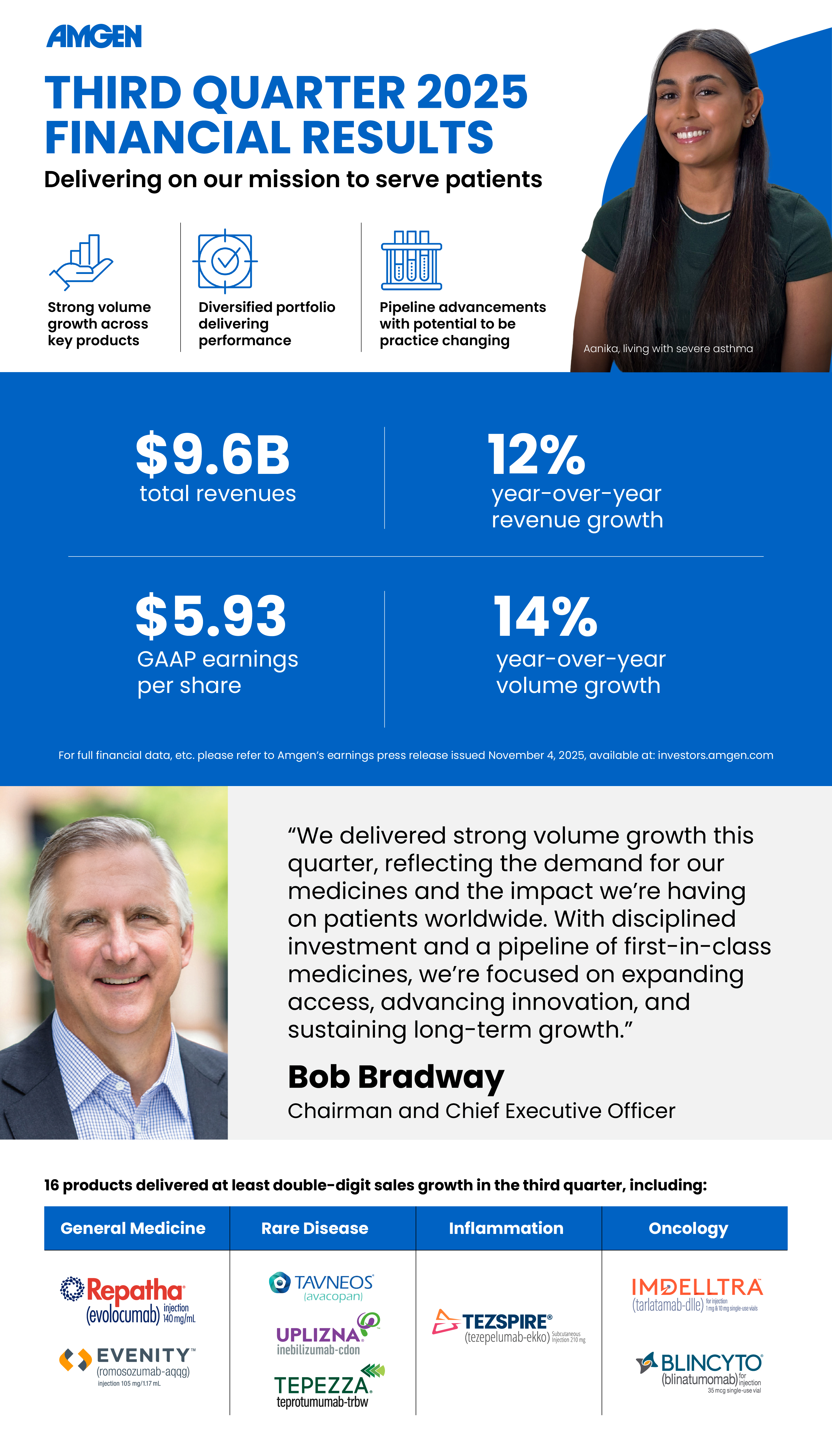 “We delivered strong volume growth this quarter, reflecting the demand for our medicines and the impact we’re having on patients worldwide. With disciplined investment and a pipeline of first-in-class medicines, we’re focused on expanding access, advancing innovation, and sustaining long-term growth,” said Bob Bradway, chairman and chief executive officer.
