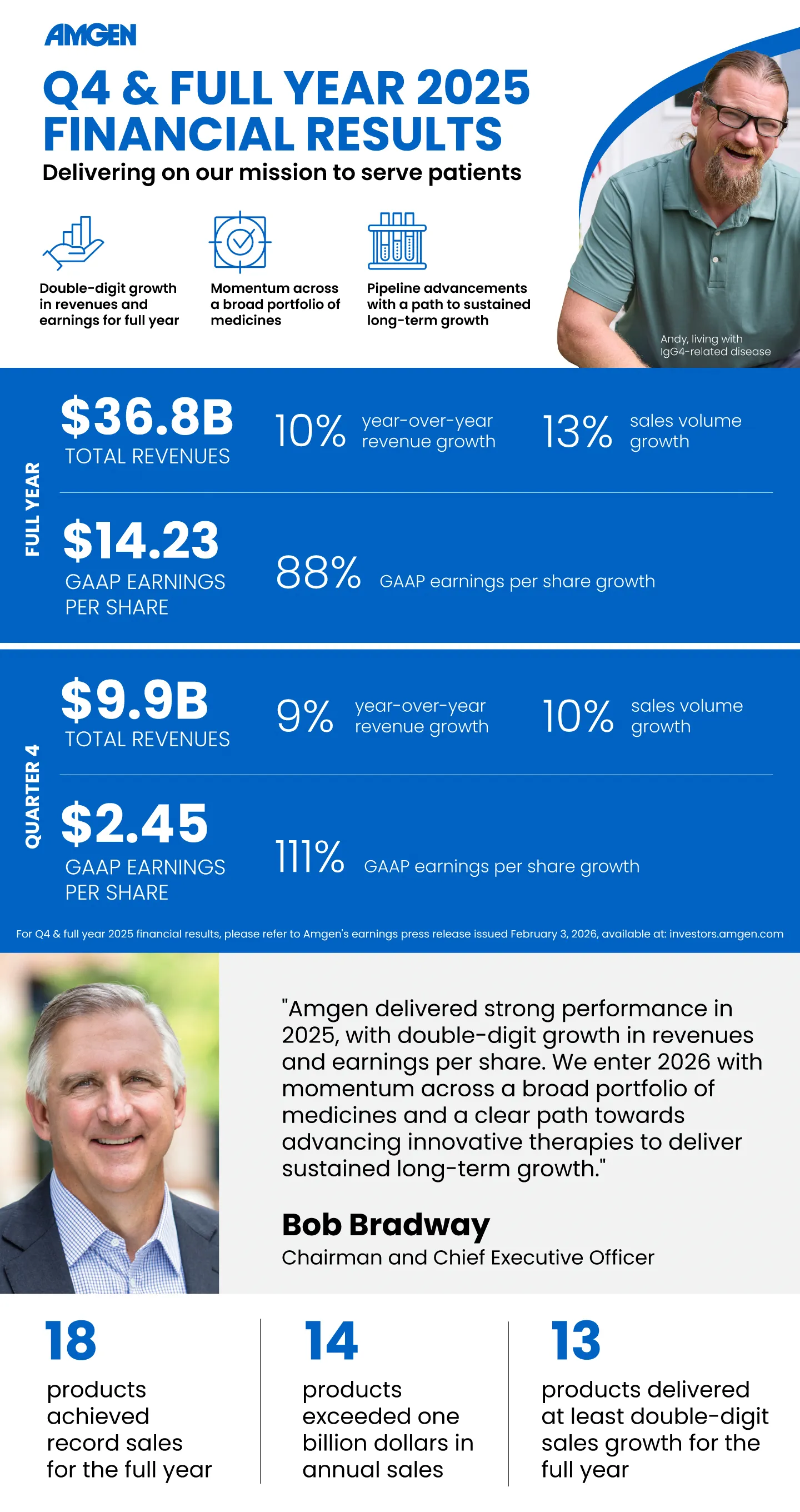 "Amgen delivered strong performance in 2025, with double-digit growth in revenues and earnings per share. We enter 2026 with momentum across a broad portfolio of medicines and a clear path towards advancing innovative therapies to deliver sustained long-term growth," said Robert A. Bradway, chairman and chief executive officer.