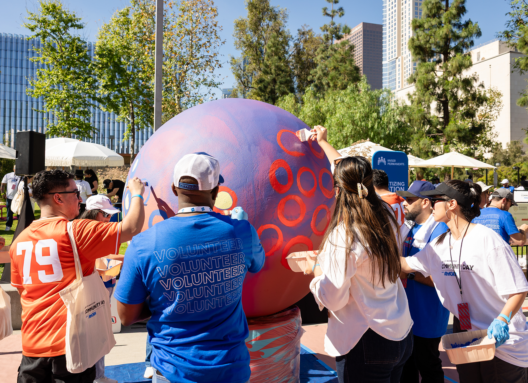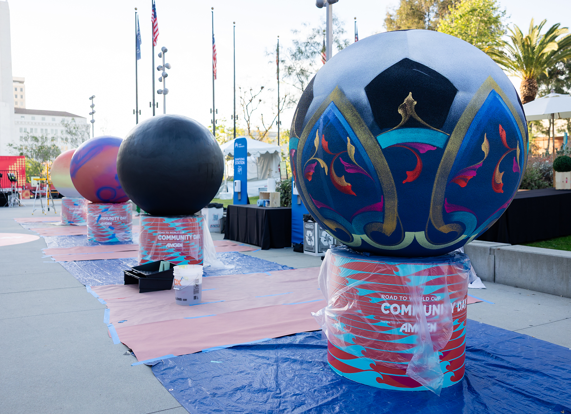 Amgen employees helped paint large soccer balls as a part of a public art display designed to welcome visitors coming to Los Angeles for the 2026 FIFA World Cup™. Photo by Katie Moos for Amgen